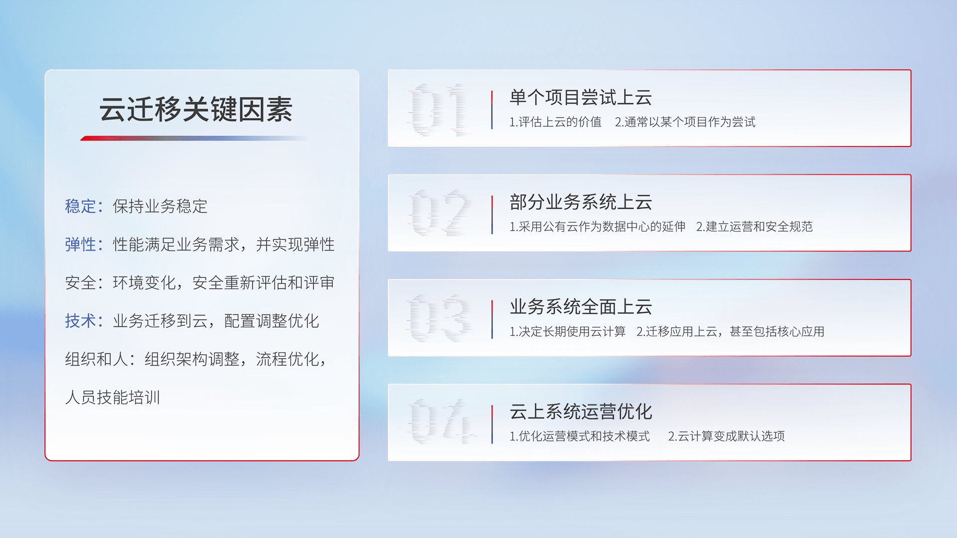 结合实际业务,,从规划设计、、云平台选型、、、、云原生改造、、数据迁移、、、、集成交付,,迁移全过程为客户识别最佳上云路径,,做好风险识别管理,,,设计网络架构、、、身份权限、、、、安全审计合规、、、操作审计、、、、日志审计、、、监控告警策略、、、、多站点容灾设计等,,对云上基础设施进行整体规划,,,,提升IT治理水平,,,,以满足弹性、、、、高可用、、、高性能的需求。。