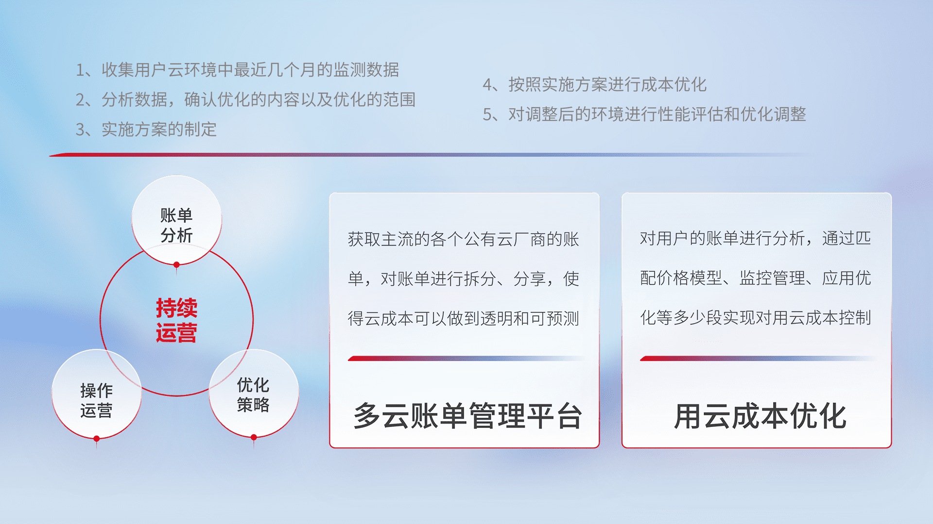 通过多云纳管,,,,以统一的资源数据模型把客户的云资源进行抽象和封装,,,进而实现对多云资源的统一操作,,,,保障云资源管理的可靠性、、、稳定性与可用性。。。量身定制化运维内容,,,,配置、、、、开发运维、、、补丁管理、、、备份、、、监控、、、认证和访问管理、、、审计和日常巡检等,,,,保障在用云过程中的可靠度,,稳定度以及高可用率。。。